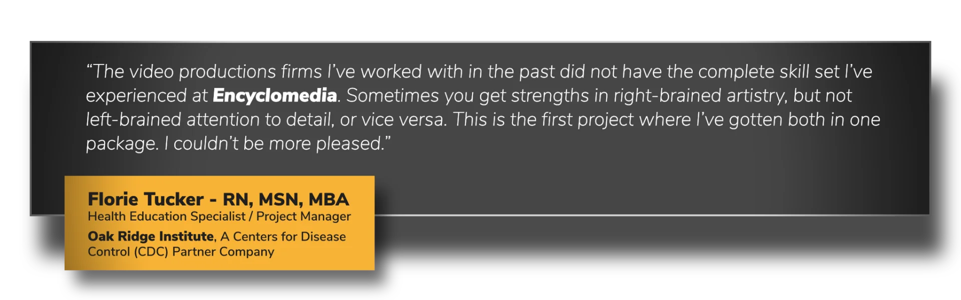 “The video productions firms I’ve worked with in the past did not have the complete skill set I’ve experienced at Encyclomedia. Sometimes you get strengths in right-brained artistry, but not left-brained attention to detail, or vice versa. This is the first project where I’ve gotten both in one package. I couldn’t be more pleased.”