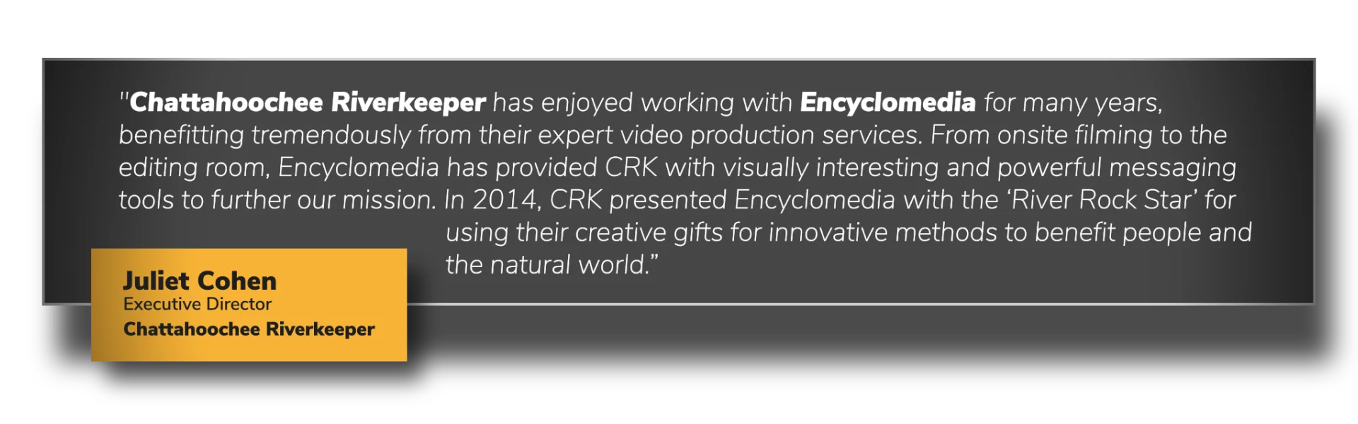 "Chattahoochee Riverkeeper has enjoyed working with Encyclomedia for many years, benefitting tremendously from their expert video production services. From onsite filming to the editing room, Encyclomedia has provided CRK with visually interesting and powerful messaging tools to further our mission. In 2014, CRK presented Encyclomedia with the ‘River Rock Star’ for using their creative gifts for innovative methods to benefit people and the natural world.”