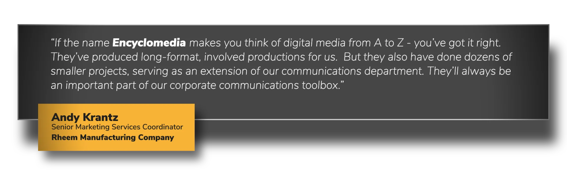 “If the name Encyclomedia makes you think of digital media from A to Z - you’ve got it right. They’ve produced long-format, involved productions for us. But they also have done dozens of smaller projects, serving as an extension of our communications department. They’ll always be an important part of our corporate communications toolbox.”