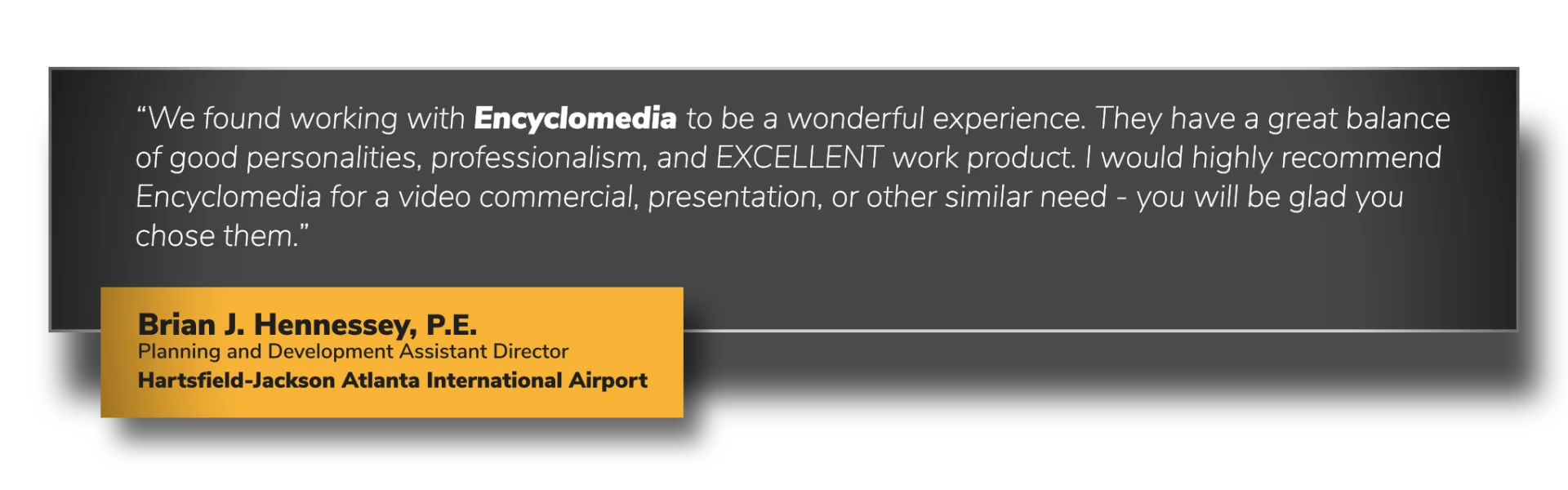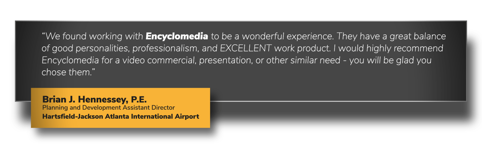 “We found working with Encyclomedia to be a wonderful experience. They have a great balance of good personalities, professionalism, and EXCELLENT work product. I would highly recommend Encyclomedia for a video commercial, presentation, or other similar need - you will be glad you chose them.”