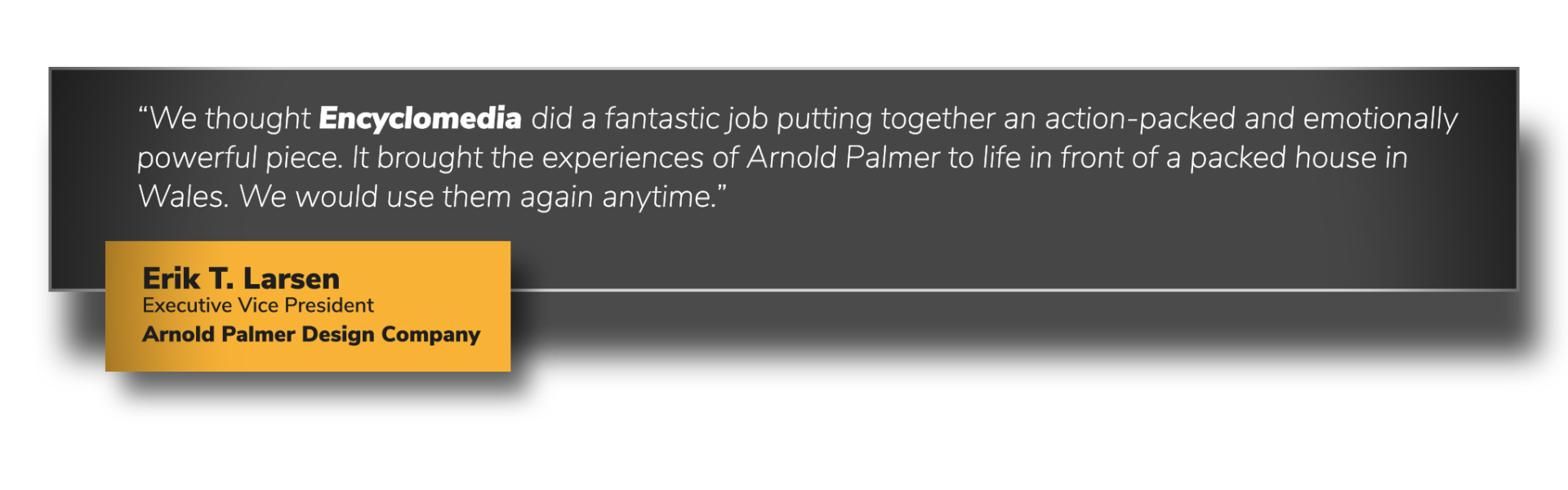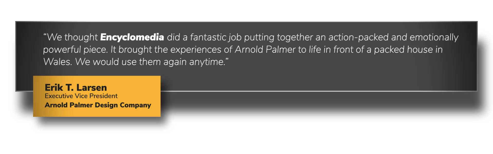 “We thought Encyclomedia did a fantastic job putting together an action-packed and emotionally powerful piece. It brought the experiences of Arnold Palmer to life in front of a packed house in Wales. We would use them again anytime.”